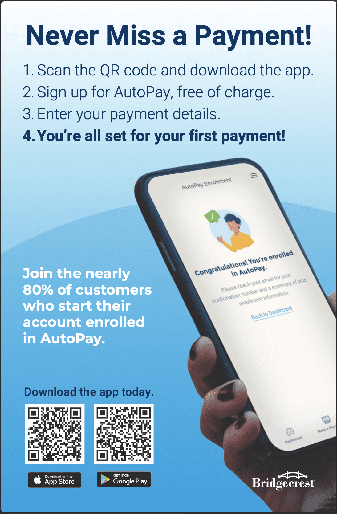 Created a visually engaging poster with clear CTAs that highlight the importance of AutoPay - never missing a payment, free of charge, alongside 80% of Bridgecrest customers.